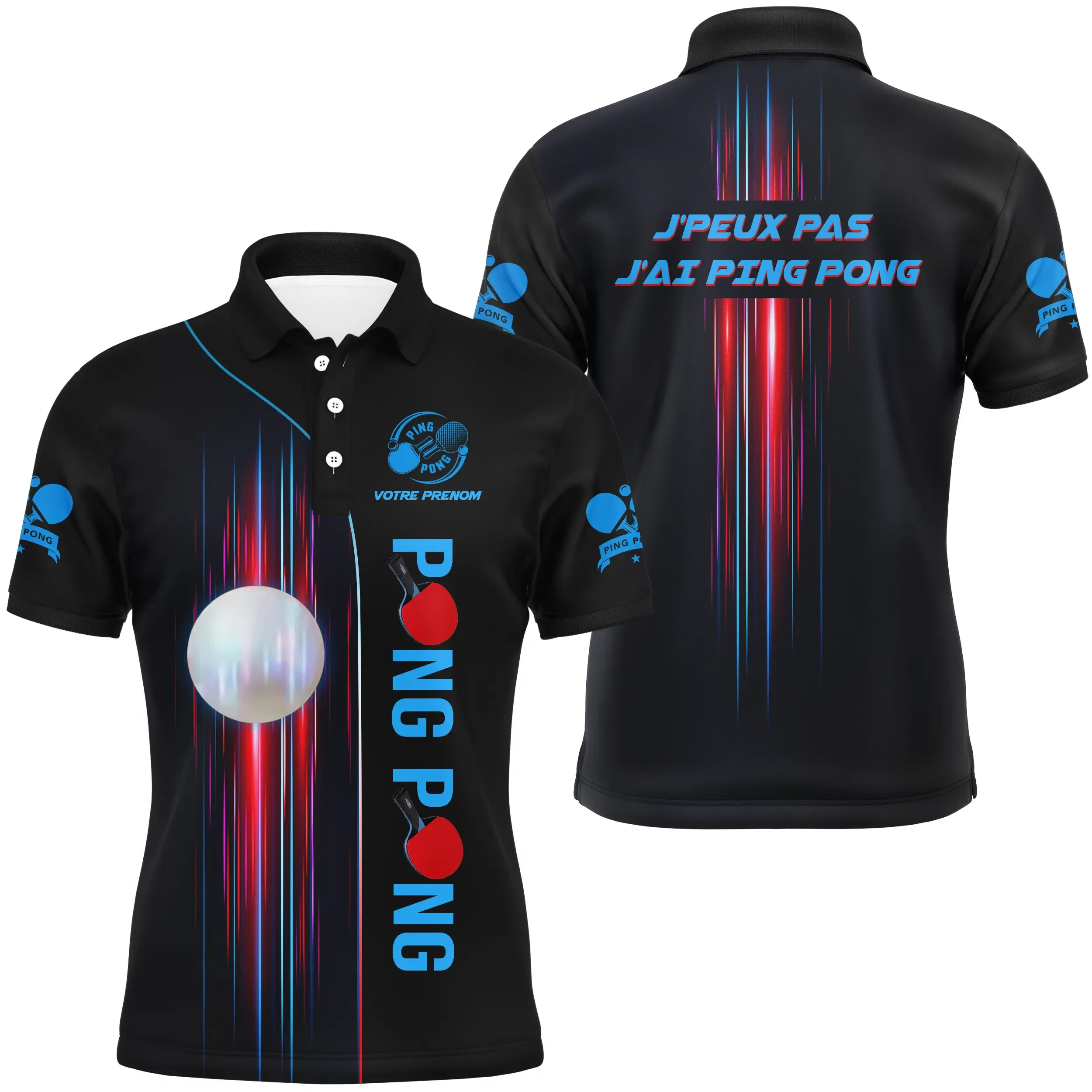 Design dynamique avec visuel « J’peux pas, j’ai Ping Pong » au dos, raquettes stylisées et effet de vitesse sur l’avant.
