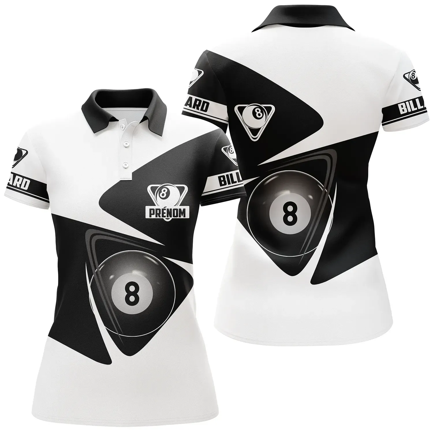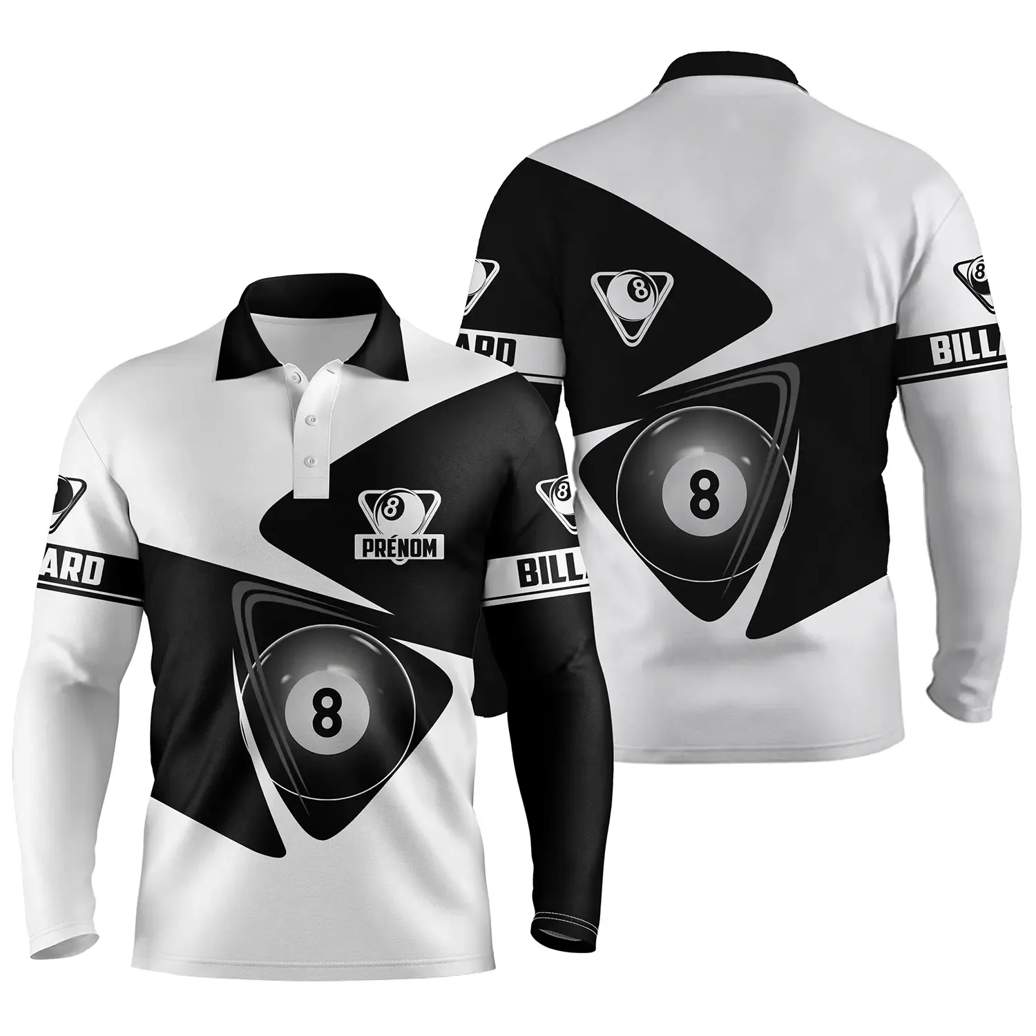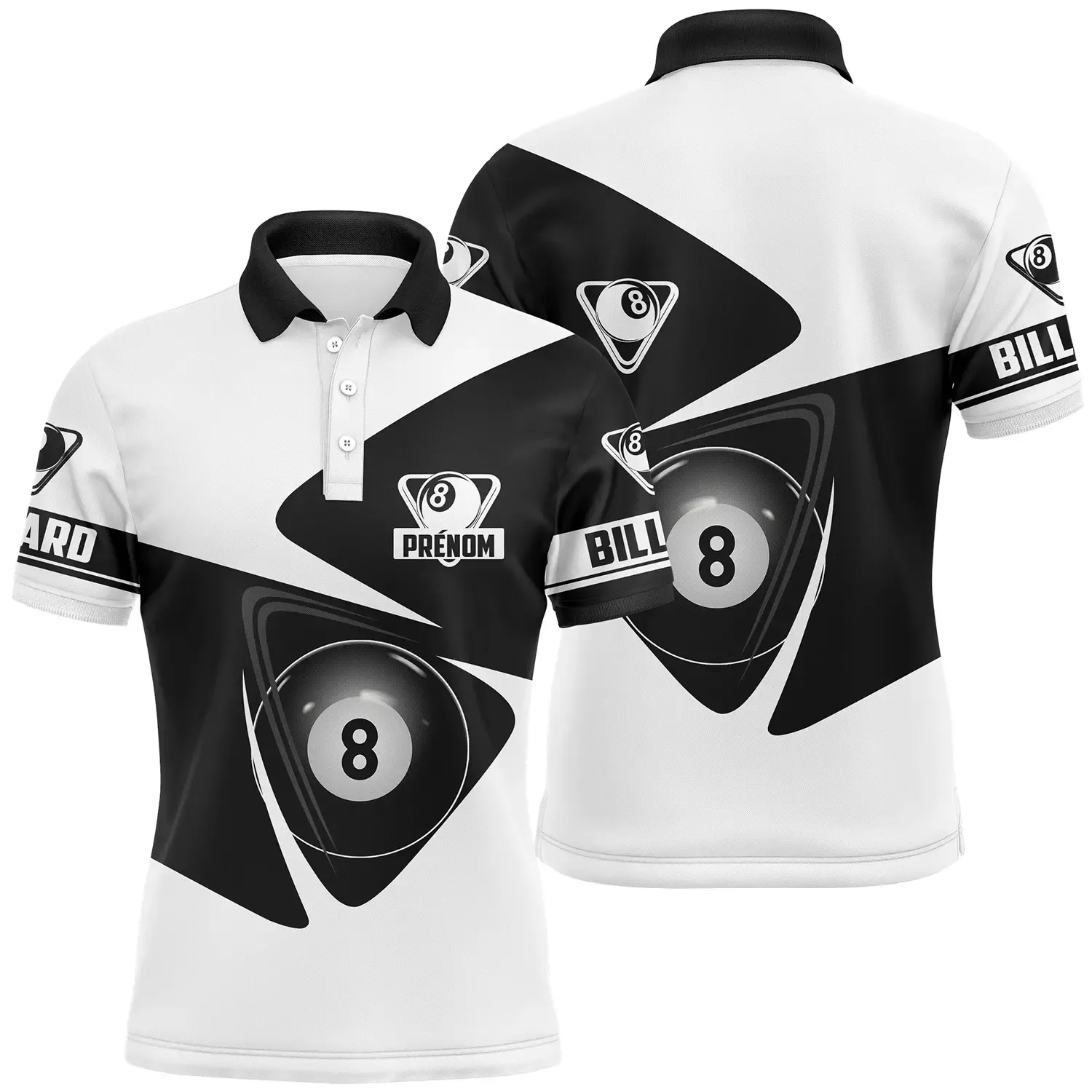 C’est plus qu’un simple polo. 🙌 Nous y imprimons votre prénom! Le motif de billard noir et blanc reflète votre passion. Ça vous distingue et vous donne ce look pro. 😎