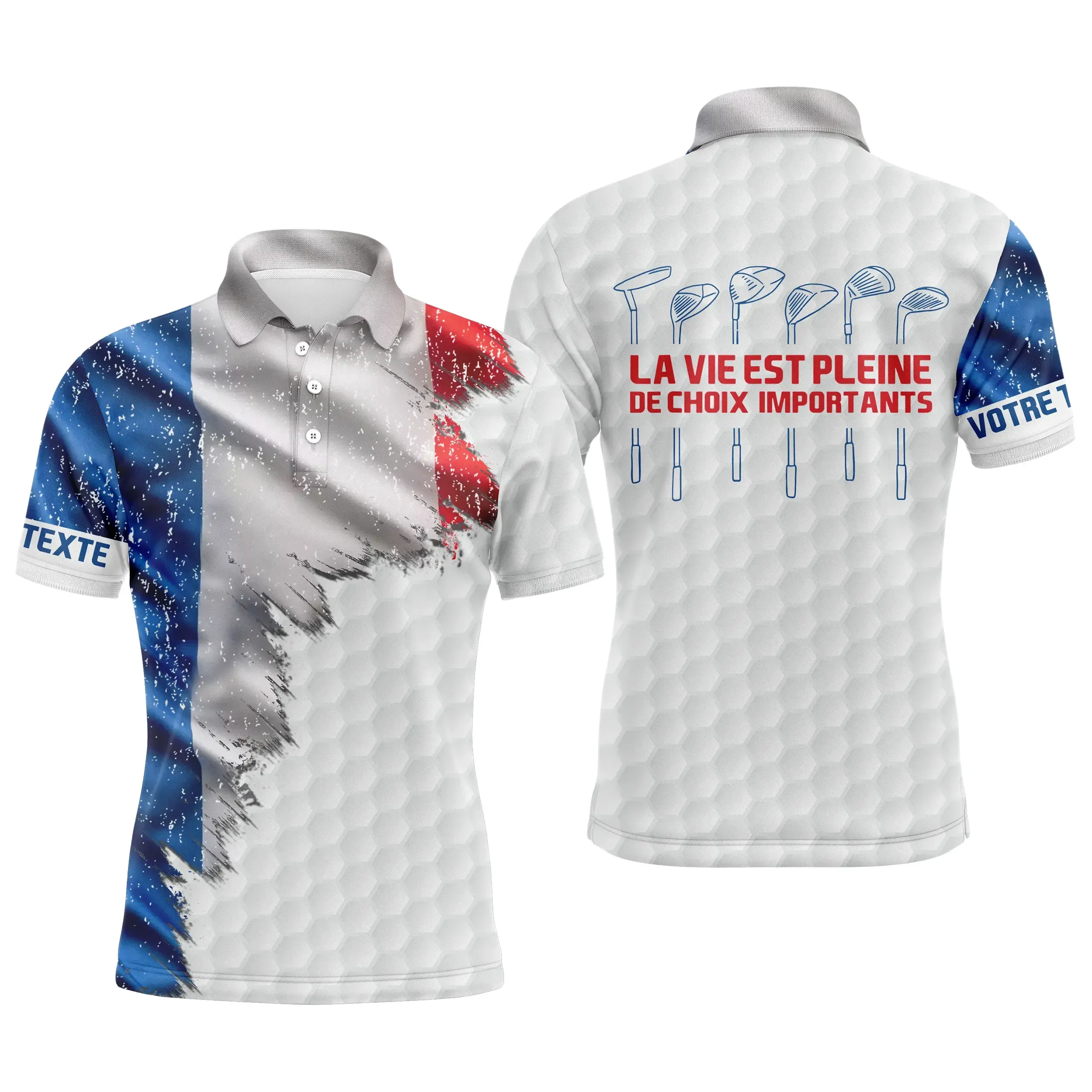 📣 Le texte « LA VIE EST PLEINE DE CHOIX IMPORTANTS » est imprimé sur le polo, rappelant à chacun que le golf est un sport où chaque décision compte. Faites passer ce message avec humour et originalité ! 😁