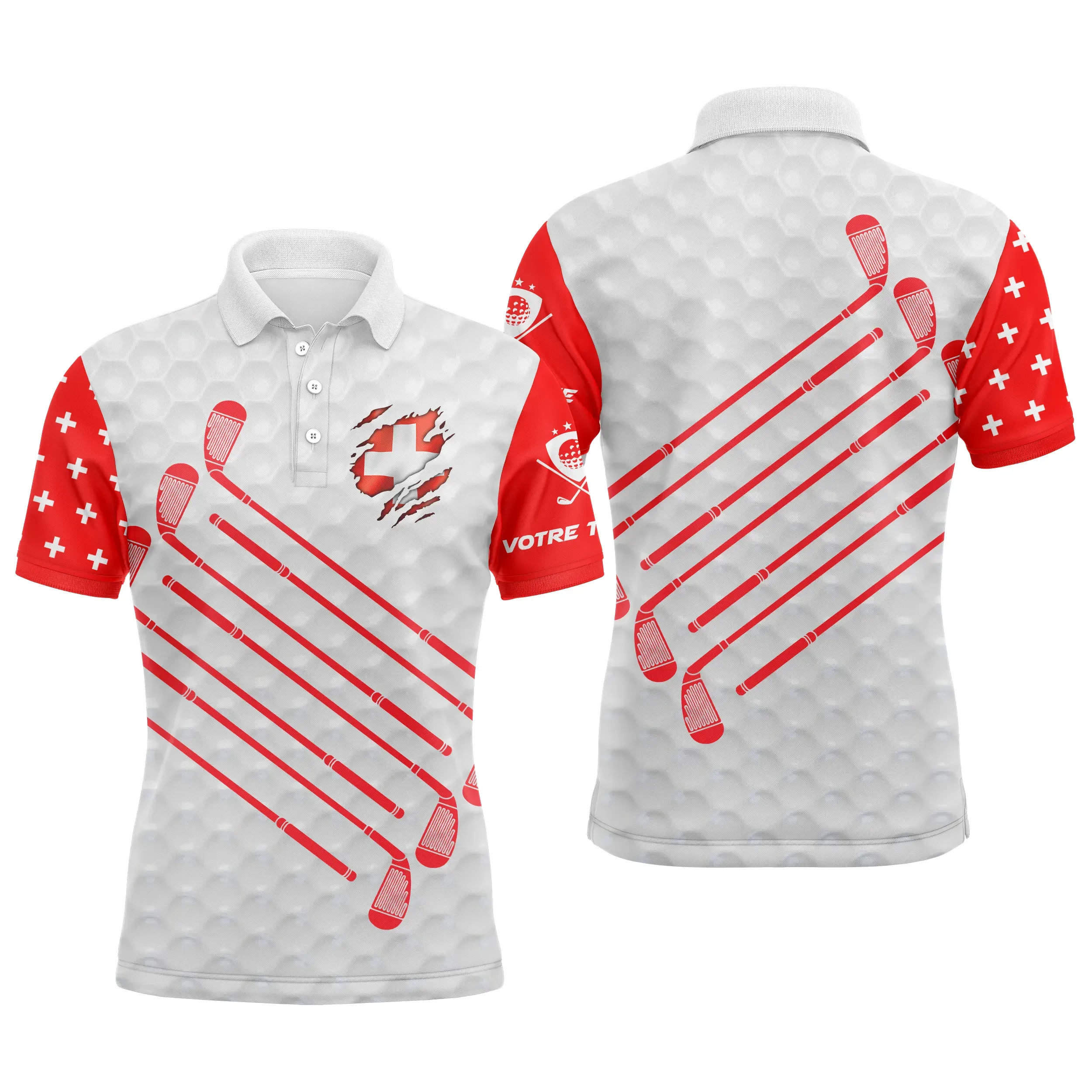 🇨🇭Vous allez adorer le motif unique de ce polo, avec le drapeau Suisse, des clubs de golf, et l’effet balles de golf. Pour rendre ce polo encore plus spécial, on peut ajouter votre prénom sur la manche gauche! 😍