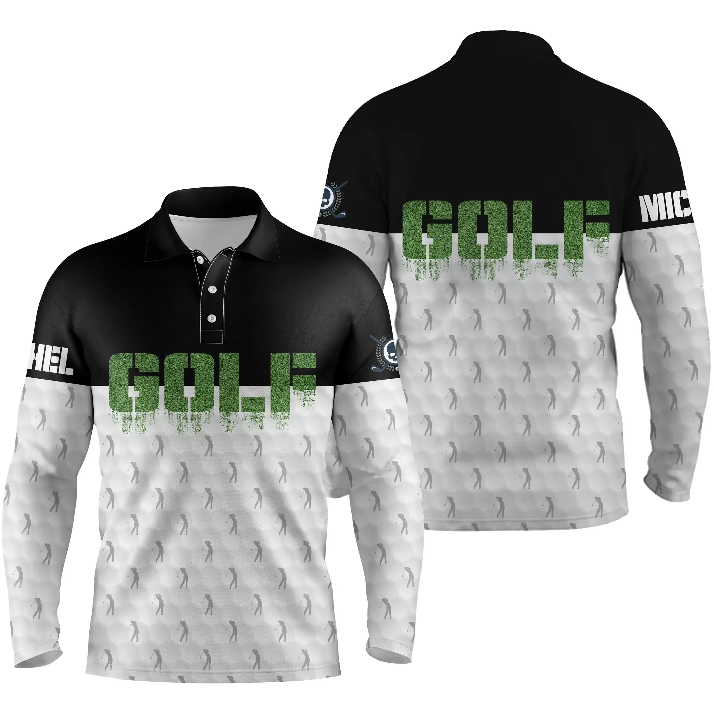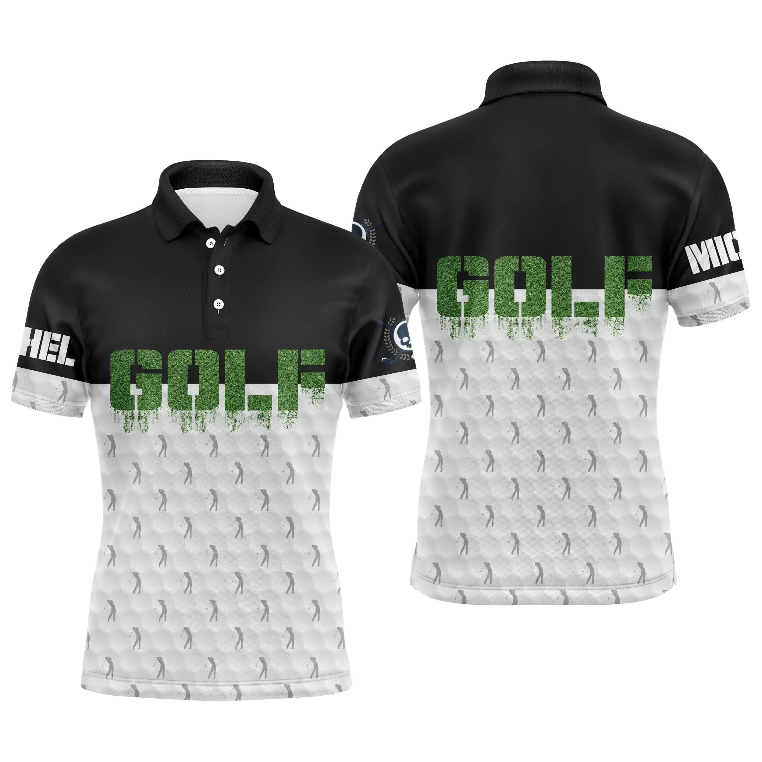 Profitez de ce polo duo noir et blanc, avec un motif unique de golfeur et de balles de golf, qui ajoutera une touche de style à votre tenue sur le parcours. 🌟 La personnalisation du prénom sur la manche droite vous permet de montrer votre passion pour ce sport tout en ayant un look unique. 💯