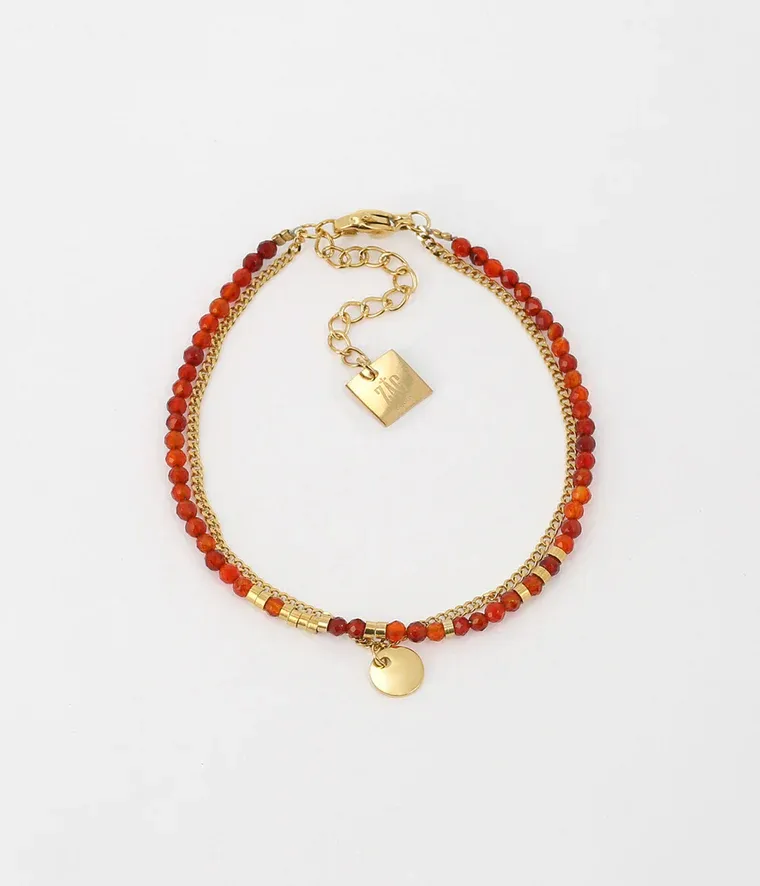 Bracelet double rang, le premier est un enfilage de pierres naturelles mélangé à des ajouts de métal, le deuxième est une petite chaîne gourmette classique.